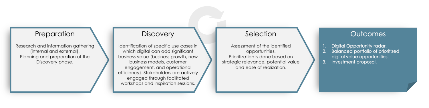 Digital is not a goal in itself of course - it must deliver significant new value to the business. It is often not obvious where to start or what to prioritize. In some cases, there are countless ideas, in other cases very few. To avoid a "shotgun" approach and to ensure digital investments are aligned with the overall vision and strategy, it is necessary to discover, assess and prioritize digital opportunities.