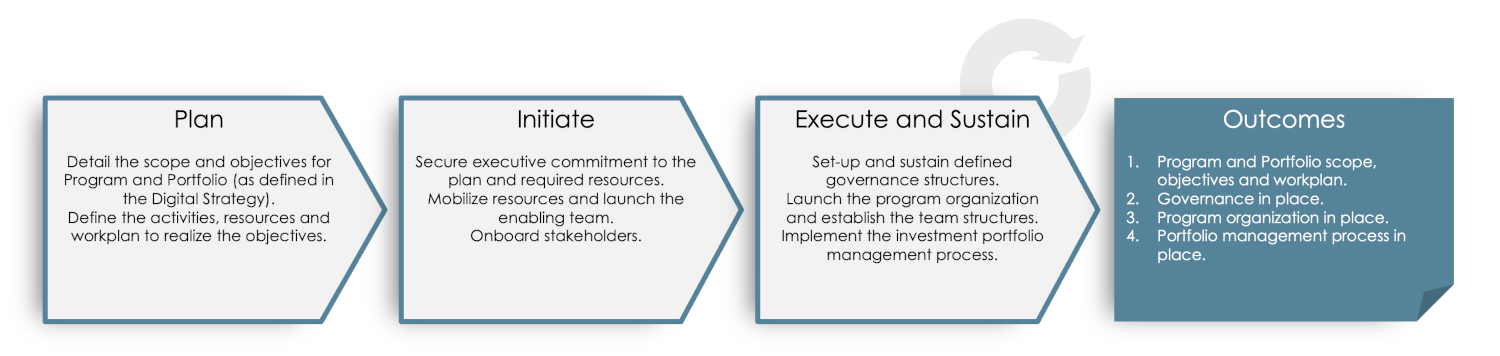 Digital Transformation is a complex and challenging undertaking that requires clear leadership, execution structures and work prioritization. The innovative and often unpredictable character of digital change requires an agile approach and continuous adaptation in response to actual outcomes and learnings. Competing demands from business stakeholders must be channelled and prioritized to prevent disruption to execution teams. A well-designed program organization and portfolio management process that is aligned to the Digital North Star and Digital Strategy provides an essential foundation for execution success.