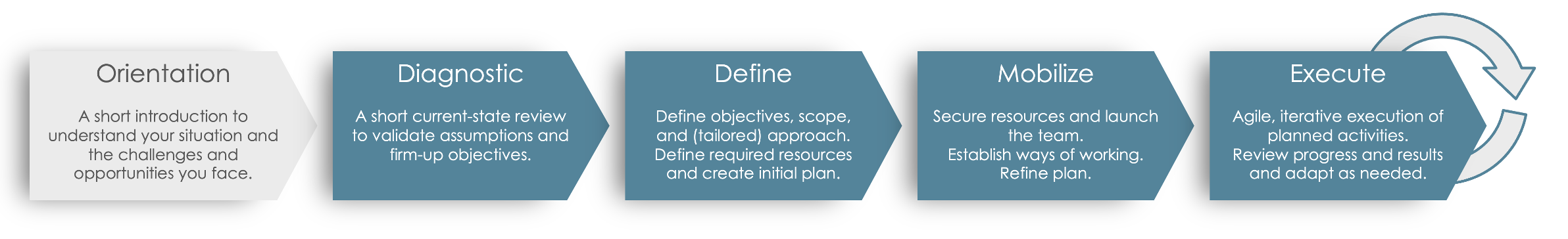 Any proposed work is of course always tailored to your specific case. The effort involved and the duration of the assignment is dependent on the defined objectives, scope and the feasibility of planning.
